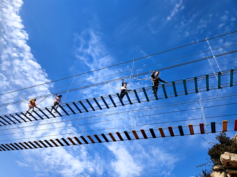 10月23日上午陽光燦爛,山東魯中公路第三工程公司員工與家屬們,沿著山峪林間石徑一路在山村古建筑中穿行而過,一行人一路相互鼓舞拾級(jí)盤旋而上經(jīng)玻璃棧道參觀了亞洲最大全琉璃藥師佛像,踏上玻璃懸索橋體驗(yàn)了一把凌空俯攬群山的樂趣,踩在高空步云橋上感覺自己的自信心嚴(yán)重爆表。齊長城上這邊鼓槌舞動(dòng)沖鋒的戰(zhàn)鼓擂地震天響,那邊凱旋鑼聲已經(jīng)響徹山谷。穿行棧道,或激流中漂流而下,或溜索飛躍柿巖,或直接就從山間羊腸小道一路小跑凱旋而歸。