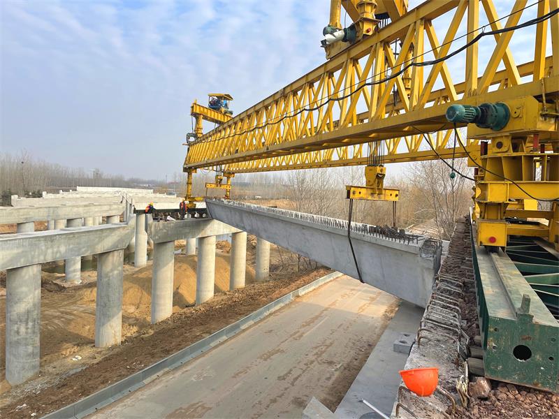 白馬河大橋全長(zhǎng)219.5米,橋梁上部結(jié)構(gòu)采用30m裝配式預(yù)應(yīng)力混凝土連續(xù)箱梁,共七跨,一跨12片共計(jì)84片。經(jīng)過(guò)項(xiàng)目人員的共同努力,白馬河大橋橋梁下部結(jié)構(gòu)已于21年年底完工。復(fù)工伊始,項(xiàng)目部就及時(shí)協(xié)調(diào)架橋機(jī)進(jìn)場(chǎng)、安裝、調(diào)試,準(zhǔn)備進(jìn)行架設(shè)工作。在人力、物力、機(jī)械、計(jì)劃等方面項(xiàng)目部可是做足了功夫,結(jié)合施工實(shí)際情況及時(shí)與業(yè)主監(jiān)理方面對(duì)接進(jìn)行方案調(diào)整;組織好人員抓好對(duì)梁板預(yù)制、儲(chǔ)存、運(yùn)輸?shù)拳h(huán)節(jié)的細(xì)節(jié)把控;聯(lián)系地方交通管制部門(mén),規(guī)劃運(yùn)梁路線;協(xié)調(diào)監(jiān)理及施工隊(duì)伍進(jìn)行梁板架設(shè)前的安全技術(shù)交底;安全隊(duì)伍在沿線增設(shè)警示標(biāo)志,警示過(guò)往行人及車(chē)輛?,F(xiàn)場(chǎng)支座安裝完成后,梁板進(jìn)入架橋機(jī)準(zhǔn)備進(jìn)行架設(shè),架設(shè)檢查合格完成后進(jìn)行臨時(shí)加固,報(bào)監(jiān)理工程師檢查,監(jiān)理工程師檢查完成后方可進(jìn)行下一片梁板的吊裝架設(shè)。整個(gè)過(guò)程緊張而有序的進(jìn)行著,項(xiàng)目部盡早準(zhǔn)備、精心組織、有序協(xié)作的工作方式贏得了業(yè)主及監(jiān)理單位的一致好評(píng)。
