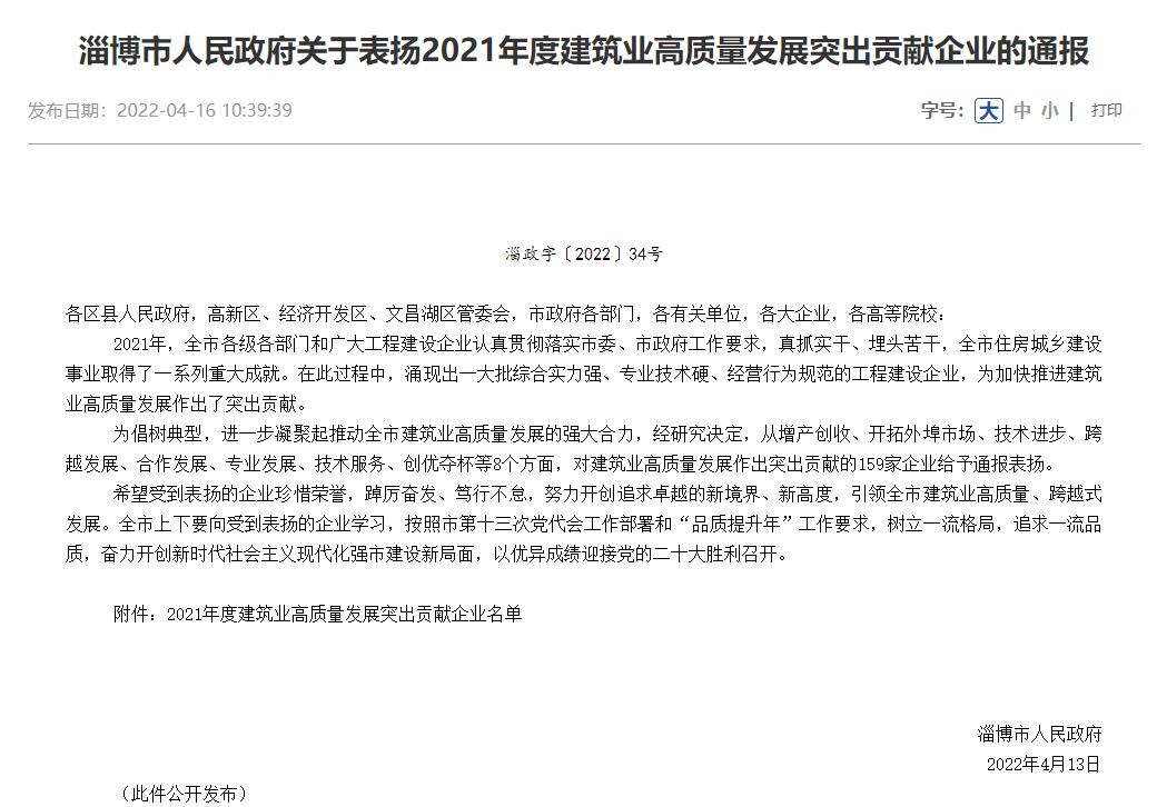 公司獲淄博市政府、淄博市住房和城鄉(xiāng)建設(shè)局通報(bào)表揚(yáng)