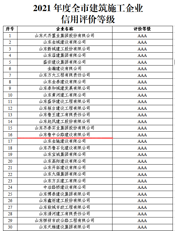 4月29日,淄博市住房和城鄉(xiāng)建設(shè)局發(fā)布《關(guān)于2021年度淄博市房地產(chǎn)開發(fā)企業(yè)、建筑施工企業(yè)、招標(biāo)代理機(jī)構(gòu)、項(xiàng)目經(jīng)理信用評價(jià)等級結(jié)果的通報(bào)》,我公司被評為AAA級信用企業(yè)。全市共1131家建筑施工企業(yè)參評,AAA級60家、AA級121家、A級844家、B級99家、C級7家。自2019年至今,公司連續(xù)被評為淄博市建筑施工AAA級信用企業(yè),被列為淄博市建筑市場責(zé)任主體信用“紅名單”。