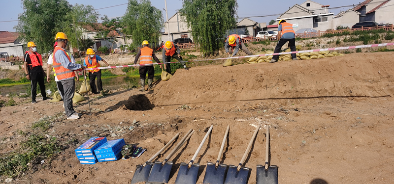 演練模擬了我部施工的污水管道工程靠近河道段由強(qiáng)降雨原因造成河道水位暴漲,即將漫過擋土墻,涌入到開挖的溝槽中的事件。發(fā)現(xiàn)“險(xiǎn)”情后,項(xiàng)目部現(xiàn)場(chǎng)施工負(fù)責(zé)人發(fā)現(xiàn)這一緊急情況立即報(bào)告給防汛總指揮,總指揮下達(dá)防汛搶險(xiǎn)命令。警戒組立即對(duì)現(xiàn)場(chǎng)進(jìn)行清場(chǎng)封閉拉警戒線,物資組將搶險(xiǎn)物資第一時(shí)間運(yùn)送到現(xiàn)場(chǎng)。搶險(xiǎn)救援組經(jīng)現(xiàn)場(chǎng)分析得出由于河道下游阻塞造成水位上漲,立即對(duì)擋土墻用沙袋加固增高,同時(shí)溝槽內(nèi)進(jìn)行排水,下游河道采用挖掘機(jī)疏通。經(jīng)過各部門努力河道水位下降險(xiǎn)情得到控制,將此消息報(bào)告給防汛總指揮,總指揮下達(dá)各小組有序撤場(chǎng)命令。
