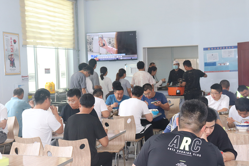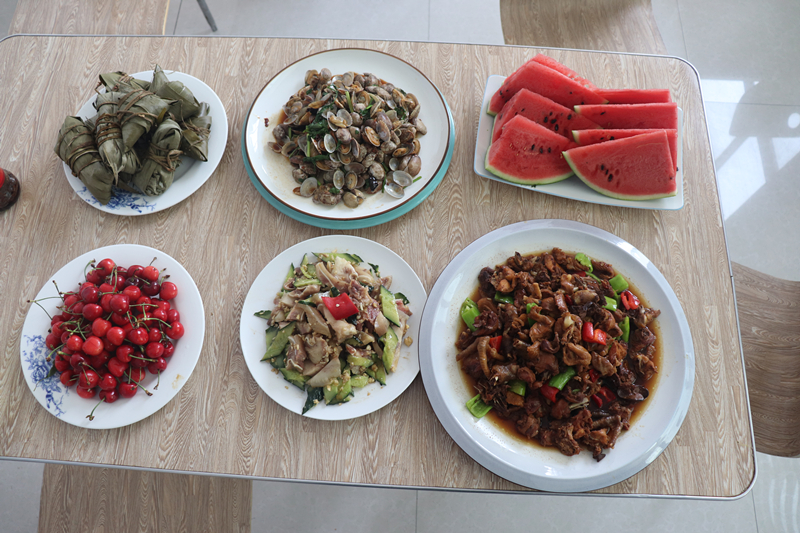 中午11時(shí)30分,忙碌了一上午的職工陸續(xù)從工地趕回項(xiàng)目部,辦公室食堂為職工準(zhǔn)備了豐富的飯菜,端午節(jié)改善伙食:辣炒花蛤、辣炒雞、豬頭肉拌黃瓜,端午節(jié)少不了的粽子,以及飯后的水果——櫻桃與西瓜。就餐時(shí),同事們歡聲笑語(yǔ),你一言我一語(yǔ),品嘗著美食,拉著家常,暫時(shí)忘卻了工作的勞累、假期堅(jiān)守工地不能與家人團(tuán)聚的思念之情。