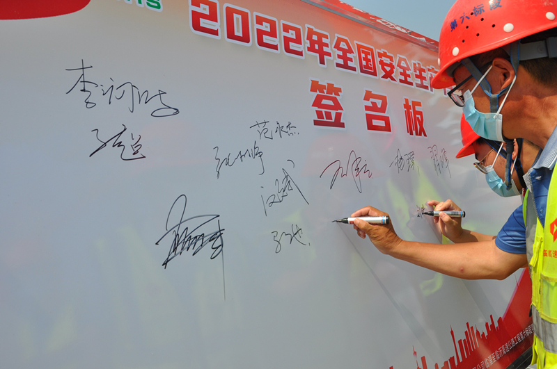 公司總部、臨臨項目和駐地監(jiān)理代表聯(lián)手點(diǎn)亮“安全生產(chǎn)月”活動啟動球,2022“安全生產(chǎn)月”正式啟動。隨后,全體參與人員滿載著決心與信心在安全展板上鄭重簽下姓名。