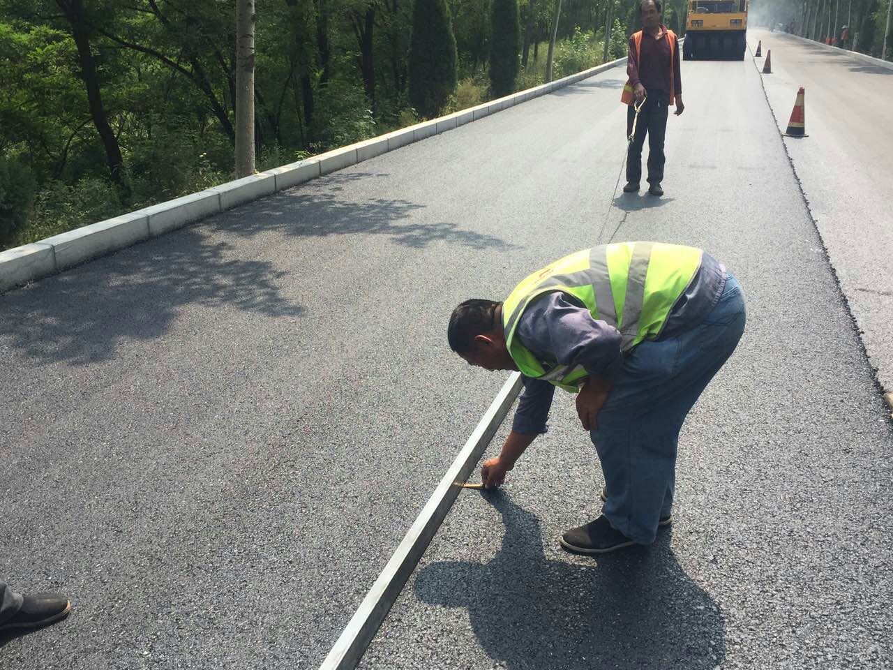 路面分公司博草線施工員在進(jìn)行平整度檢測