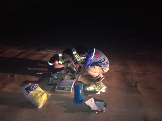 凌晨?jī)牲c(diǎn)二十分,借著車燈檢測(cè)路基壓實(shí)度的質(zhì)檢員袁建波、宋喜才、武向東。