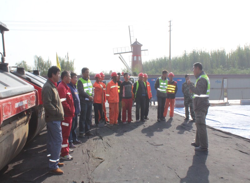 安全交底會(huì)現(xiàn)場,安全辦公室人員正在講解瀝青施工安全注意事項(xiàng)